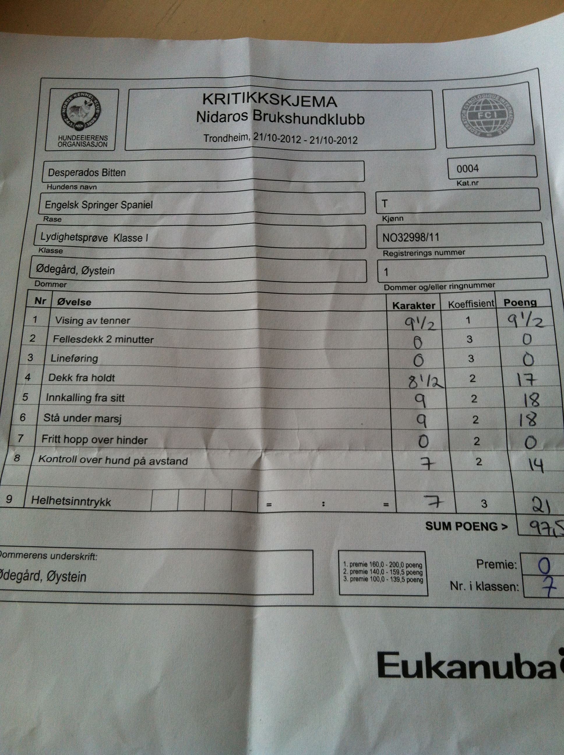Bitten satt helt rolig og fint og vi fikk 10 på tannvisningen. I fellesdekken lå hun litt skjevt og ga litt lyd. Det førte til at vi fikk 8,5.