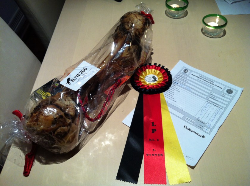 Premien var et DIGERT bein, et blinkelys til halsbåndet og en fin ball med snor fra Elite zoo på Stjørdal.