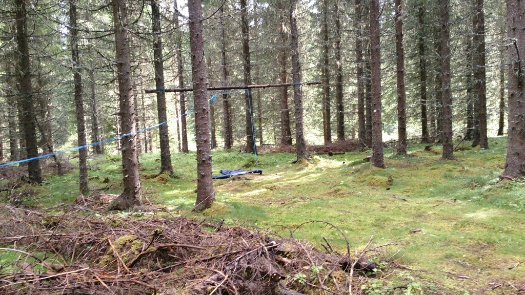 Hundens følsomhet for lyd testes ved at kjettinger plutselig dras over bølgeblikk mens vi går forbi… Hunden får god tid til å avreagere etter opplevelsene. Bølgeblikken med kjettingene ligger bak trestammene.