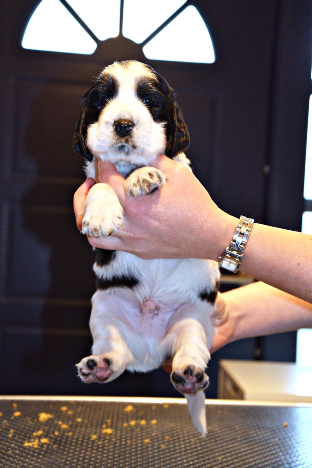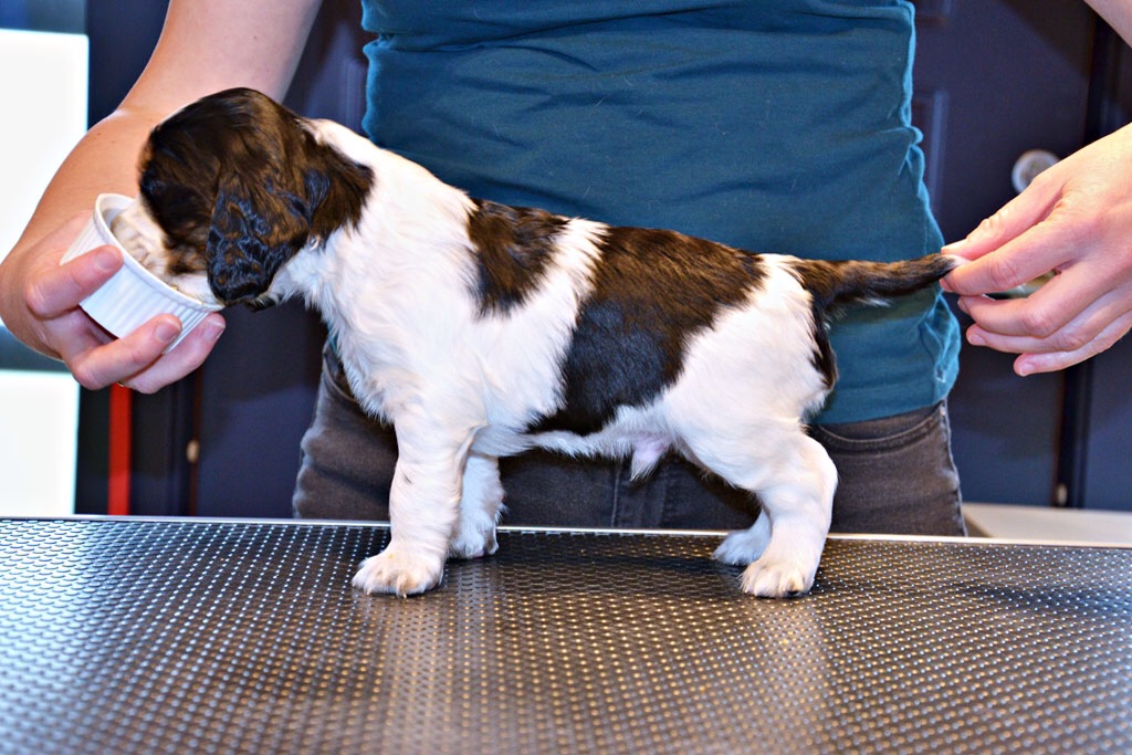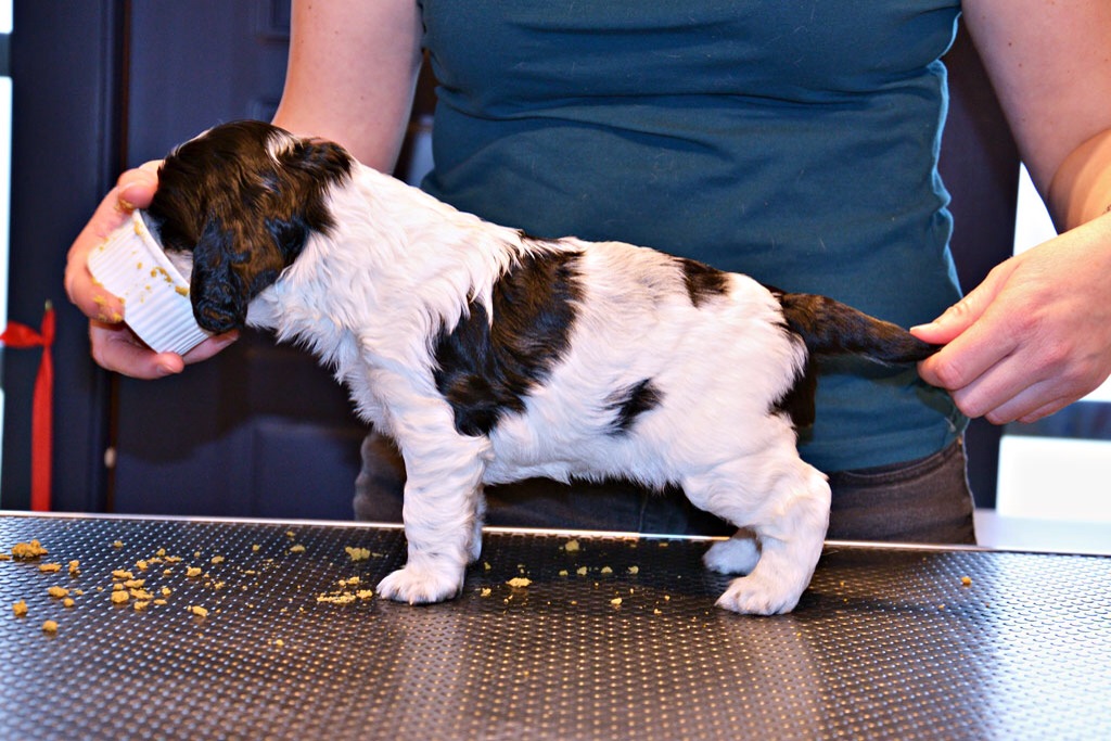 Et helt soverom er tatt i bruk som valperom, for nå trenger de stadig større plass å boltre seg på. Nå gjør ikke valpene fra seg i valpekassen lenger, men på aviser på gulvet utenfor. Vi har ikke hatt noe problem med løs mage, orm eller lignende. Valpene har fått Banminth ormekur i to omganger, og vil få to behandlinger til før levering, her følger vi produsentens anbefaling.