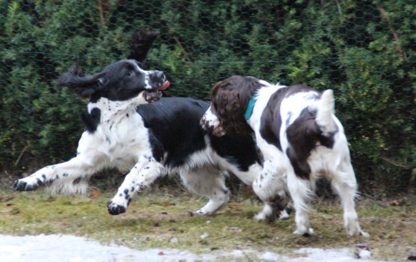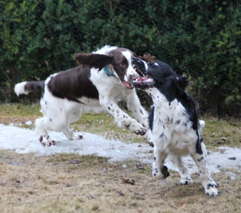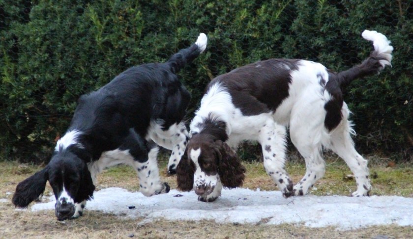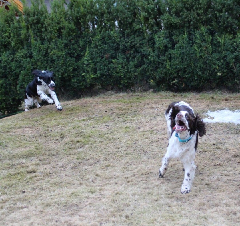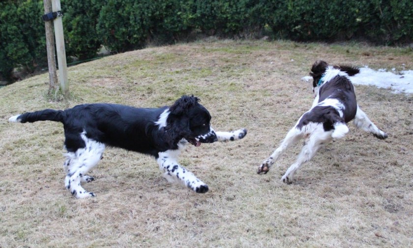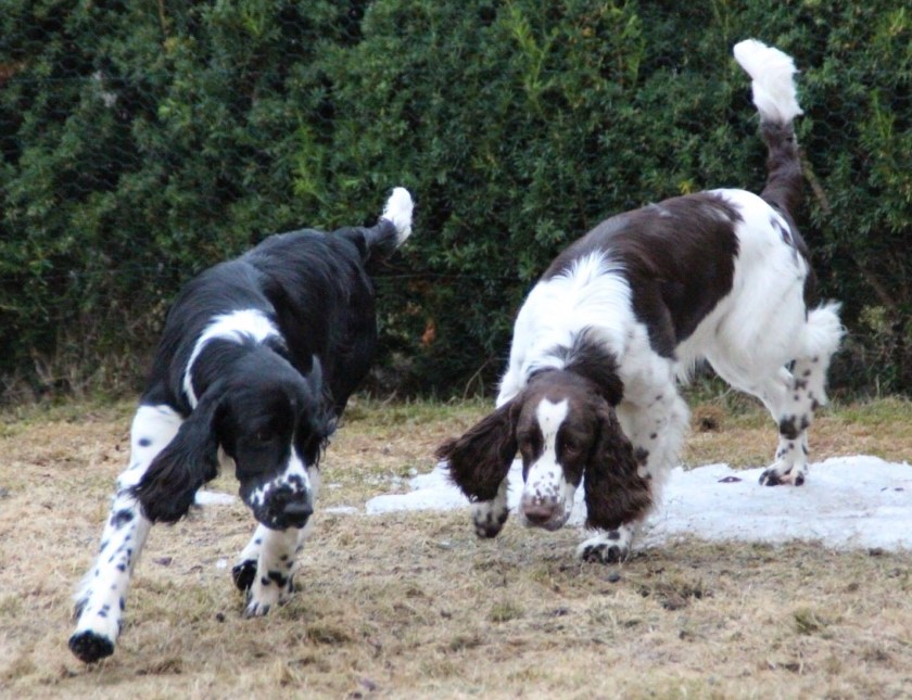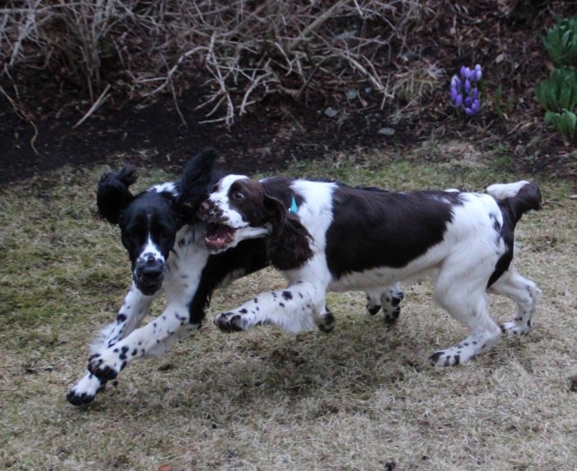 Lotta var innom for en liten klipp for noen dager siden. Etterpå fikk de to søstrene utfolde seg i hagen. Tommy har ordnet gjerde rundt hele hagen nå, det er kjekt for hundene og veldig praktisk for oss andre 🙂