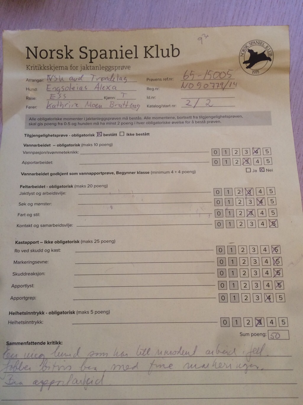 Ti av tolv hunder besto prøven. Alexa ble blant de tre beste hundene målt etter poeng! Jaktcockeren Råkkerompas Lerke ble suverent beste hund med 59 av 60 mulige poeng!