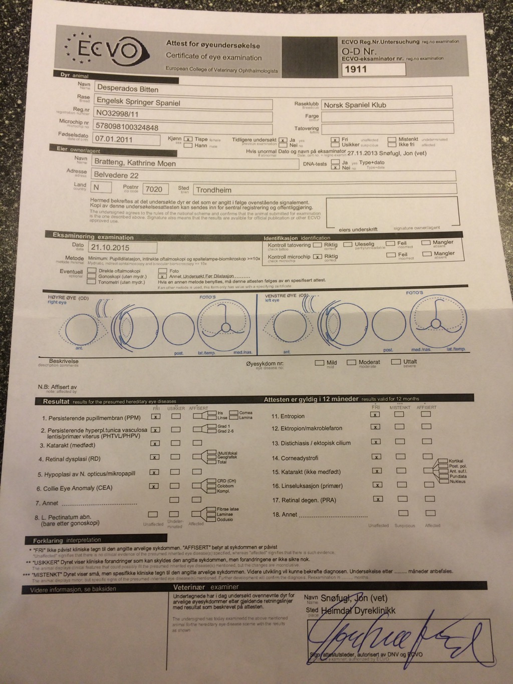 Jeg er veldig glad for at Bitten ikke har noen problemer med øynene. Med dette har hun tatt de testene som er nødvendig før hennes neste valpekull. Vi går derfor videre med planlegging av valper til sommeren 🙂
