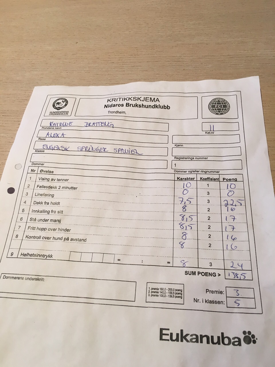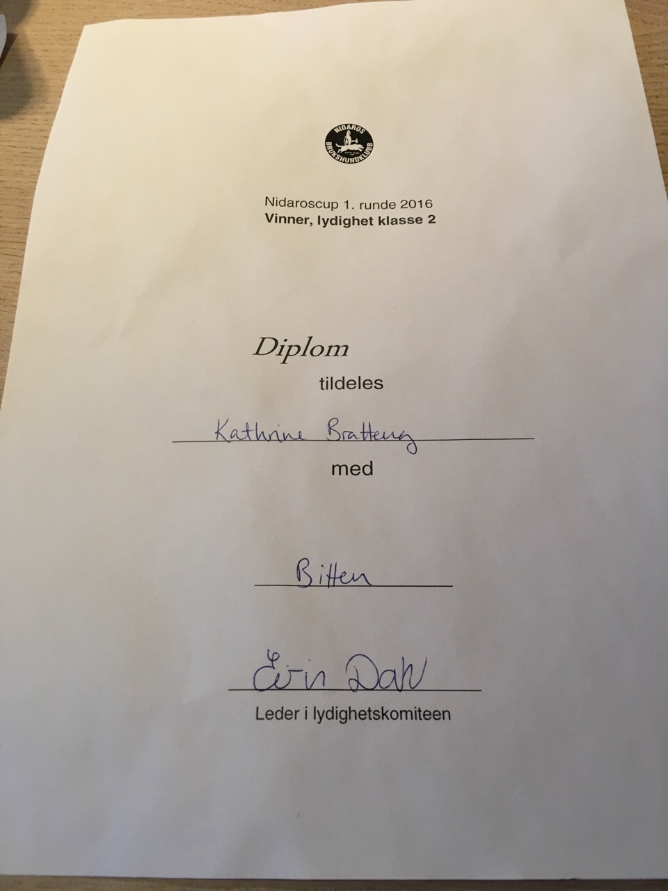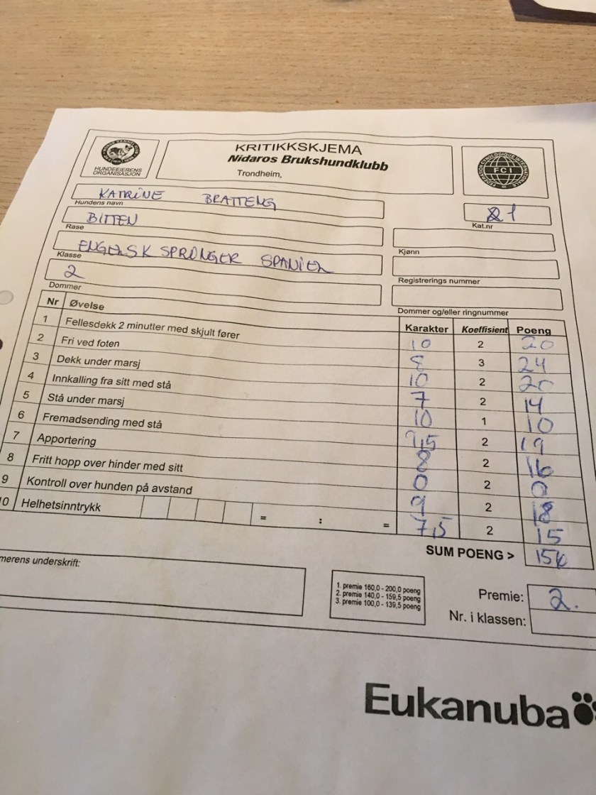 Bitten gjorde en fin prøve i dag, hun vant faktisk klasse 2! Hun fikk 10 poeng på tre øvelser, fellesdekk med skjult fører, dekk under marsj og stå under marsj. Videre fikk hun 9,5 på fremadsending, 9 på avstandskommandering(!), 8 på fri ved fot(!) og apportering og 7 på innkalling med stå. Jeg måtte dobbeltkommandere henne ved innkallingen, den var ny! Dessverre ble det en null på hopp over hinder. Hun satte seg for skjevt og hoppet derfor ikke over hinderet på vei tilbake… Hmm… 7,5 i helhet.