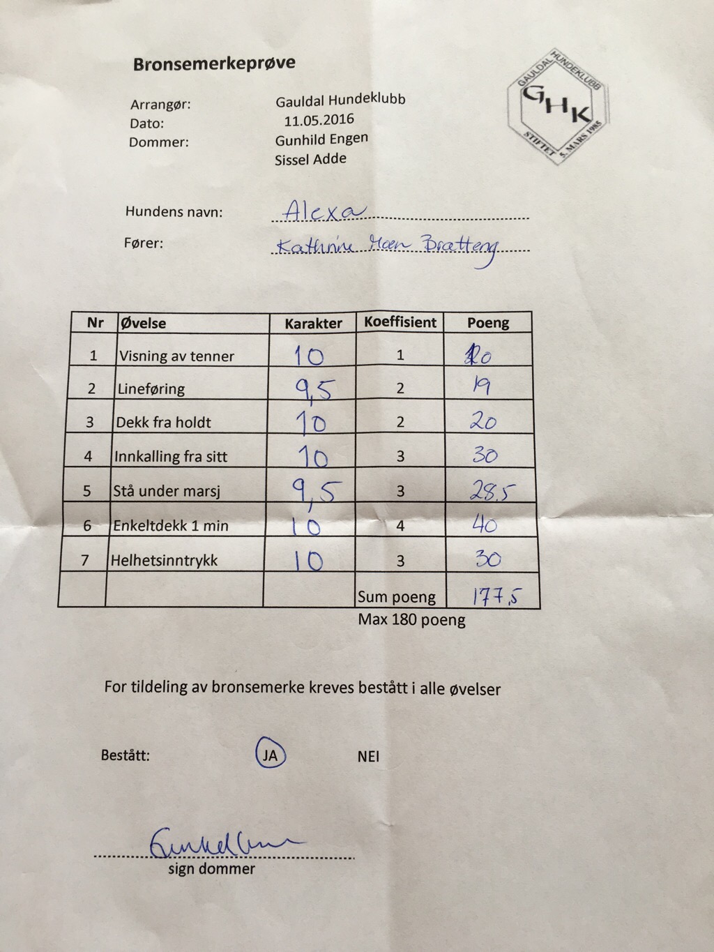 Alexa fikk 177,5 poeng av 180 mulige! Jeg er kjempefornøyd med henne. Hun er så oppmerksom og kvikk, og helt herlig å jobbe med ❤