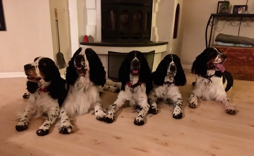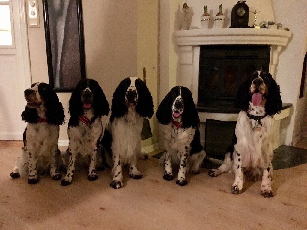 Fra venstre på bildet ovenfor: Helma (Engsoleias Aleah), Alexa (Engsoleias Alexa), Laro (Engsoleias Ace), mamma Desperados Bitten og Copper (Engsoleias Aidan).