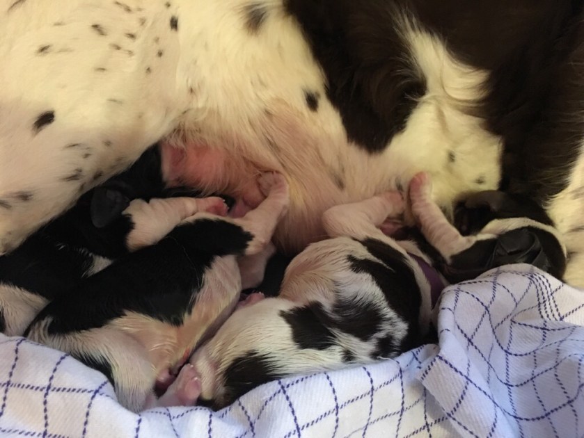 Valpene hadde fødselsvekter fra 302-441 gram og er livskraftige og friske. De er i fargene svart/ hvit, svart/hvit og tan og leverbrun/hvit og tan.