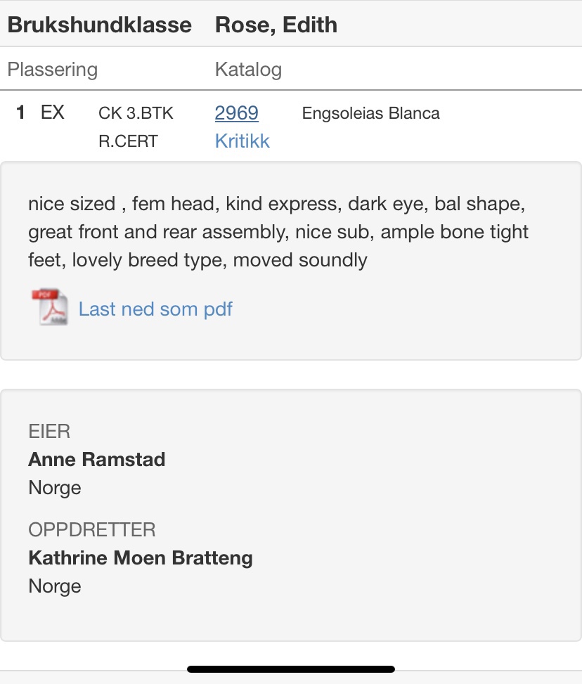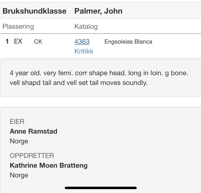 Anne Ramstad og Dina Ramstad Vie deltok på Dogs4All på Lillestrøm 15.-17. november. Fredag 15. dømte Edith Rose fra kennel Rosannoch i Skottland. Wilma (Engsoleias Blanca) ble beste tispe i brukshundklasse med ck, og tredje beste tispe med reservecert! Hun fikk en nydelig kritikk: