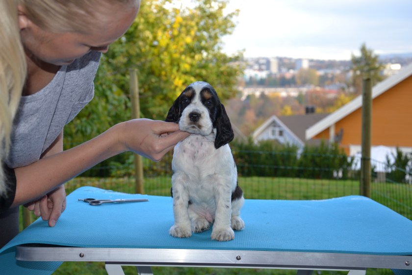 Tiden flyr! Valpene har allerede blitt fem uker gamle! I dag har vi hatt besøk av Lise Tromsdal fra Kennel Coco Line, som har gitt meg et handler-kurs og hjulpet meg med å gi valpene deres aller første springer-klipp! Vi fikk også tatt nye hode- og ståbilder. Lise er proff i faget! Tusen takk, Lise 🙂 Nå gjør jeg det slik fremover at jeg legger ut bilder av gutta først, deretter jentene. Det er flere av dere som ønsker å sammenligne de ulike valpene med samme kjønn, og da blir det lettere for dere. Vekten øker jevnt og trutt, og gjennomsnittsvekten er nå 2,5 kg. I helgen har vi hatt valpebesøk fra Oslo, Kristiansand og Trondheim. Veldig hyggelig å møte dere! 🙂 Engsoleias Ace Engsoleias Aro Engsoleias Aidan Engsoleias Aleah Engsoleias Alexa Engsoleias Adira Engsoleias Ayla Engsoleias Alina Er de ikke nydelige? ❤
