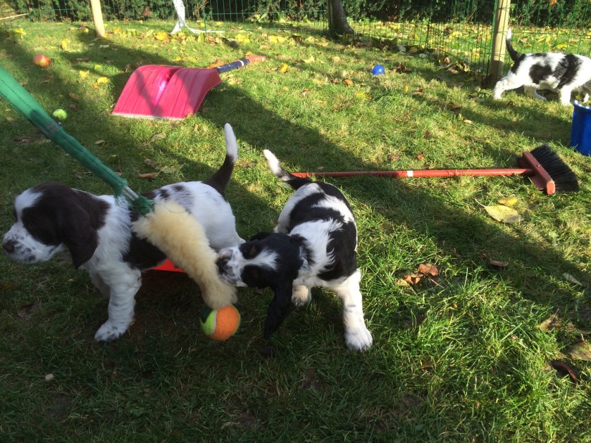 Det er travle dager i heimen for tida 🙂 Valpene skal ha mat, stell og kos, men de skal også sosialiseres og miljøtrenes. Gjennom sosialiseringsprosessen lærer valpene å kommunisere med andre. Hunden skal også bli kjent med miljøet de lever i og mange forskjellige hverdagssituasjoner. Den læringen som skjer ved miljøtrening kalles habituering, og innebærer at hunden blir vant til hverdagslige sysler. En hund som aldri har opplevd høye lyder eller å kjøre bil i denne viktige perioden, vil kunne bli redd i slike situasjoner i framtiden. Vi har trent på håndtering, det vil si at vi sjekker poter, ører, hale, tenner og bitt, og vi stiller opp hunden på et bord. Dette er nyttig trening til senere, for eksempel når hunden må til dyrlegen eller skal på utstilling eller prøve. Valpene har fått bli med oss i ulike rom, og de får oppleve ulike lyder, som vaskemaskinen som sentrifugerer, hårføner, klippemaskin, skramling med lokk og kjøkkenutstyr med mer. De har også fått prøve seg på forskjellige underlag, som gress, belegningsstein, parkett, kaldt og varmt …